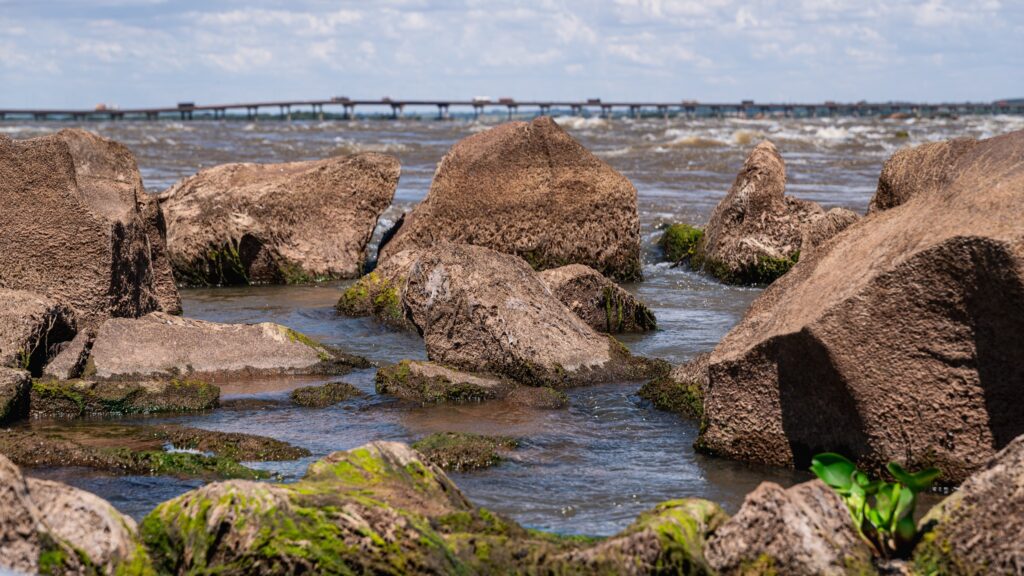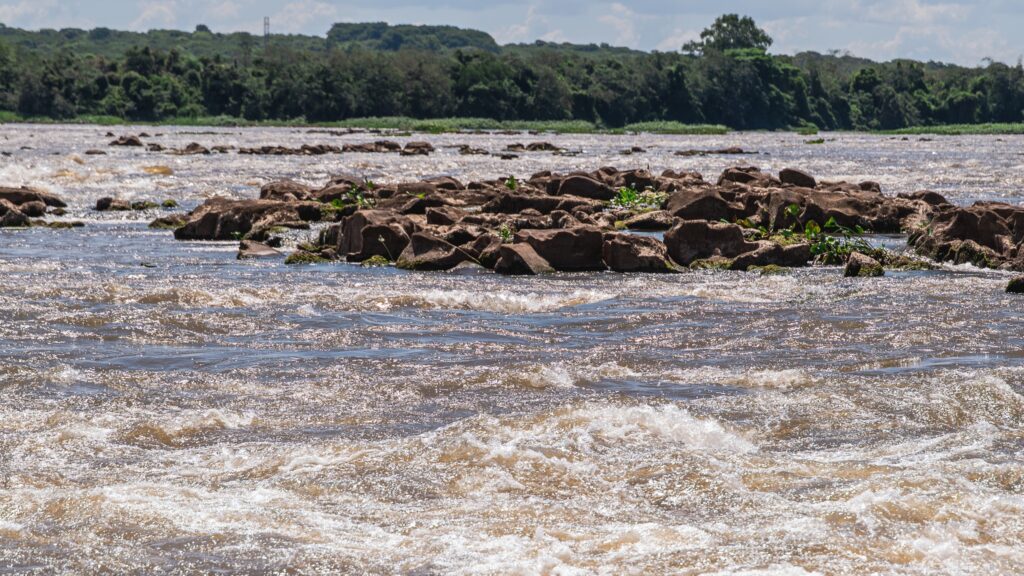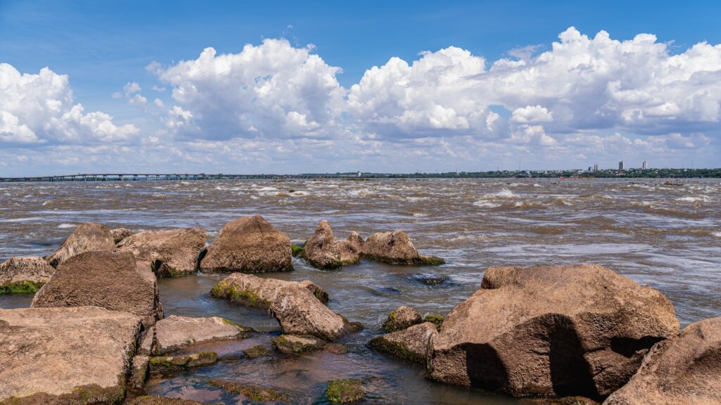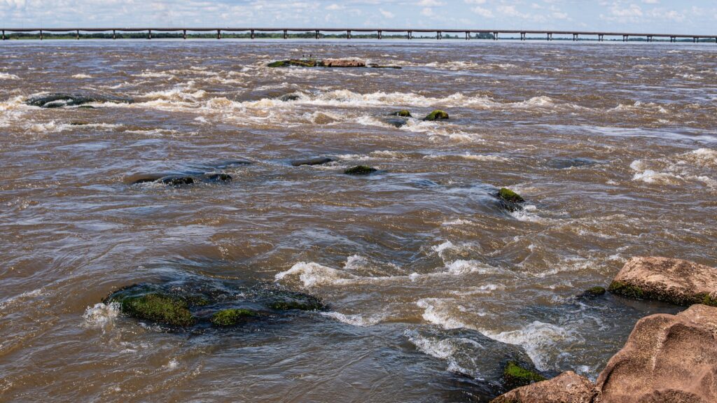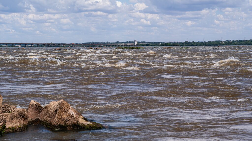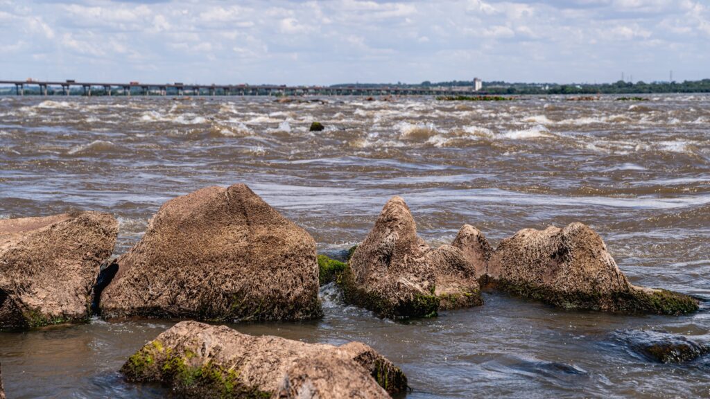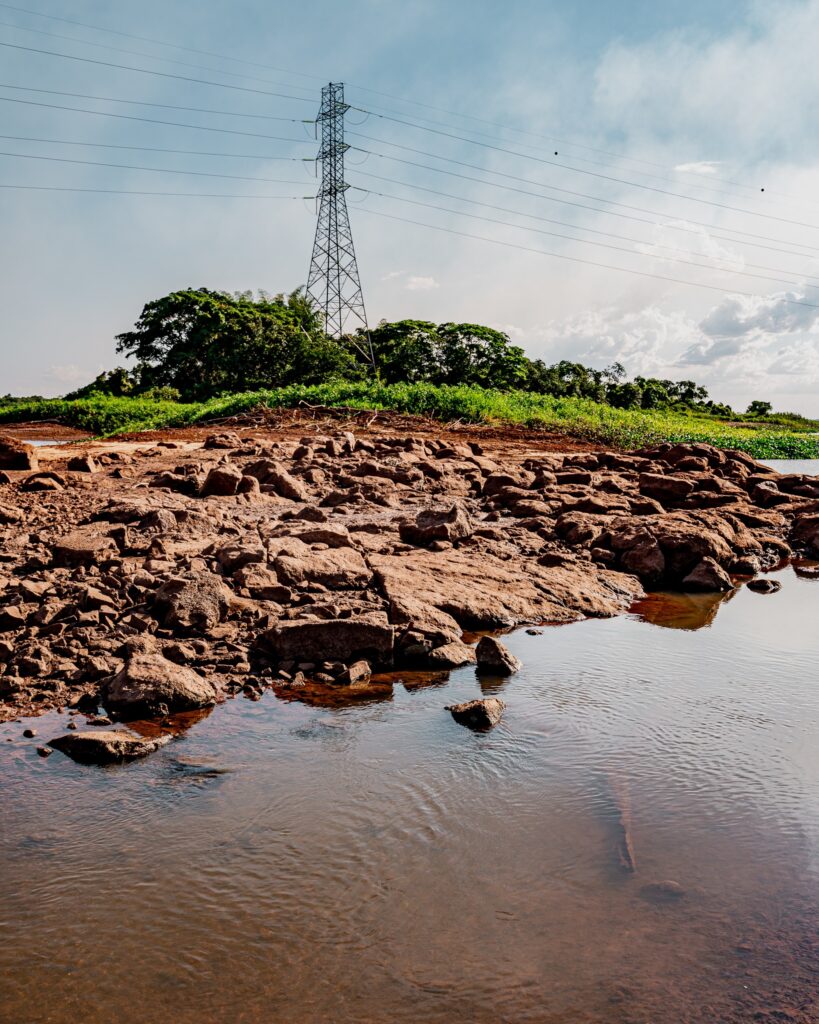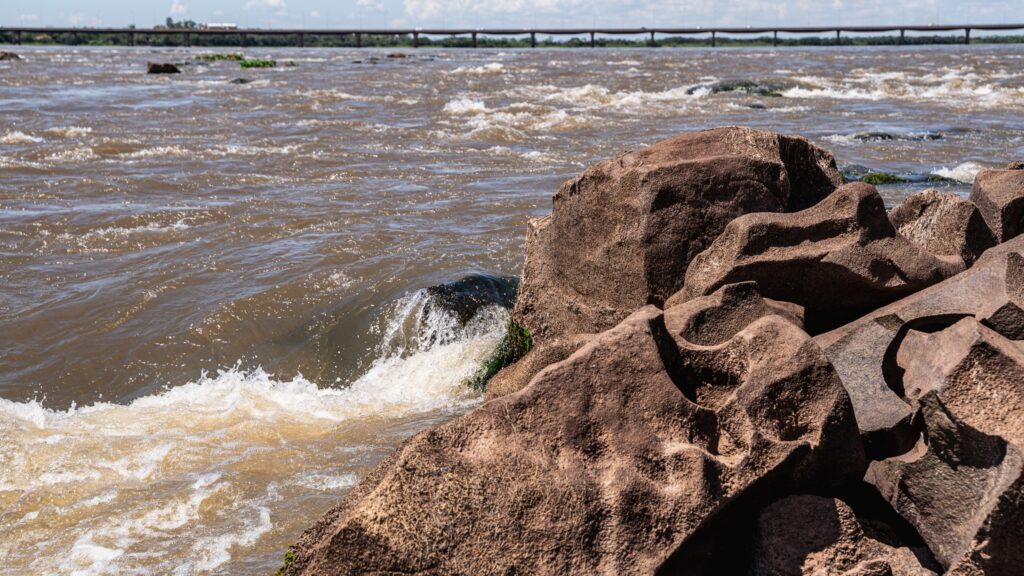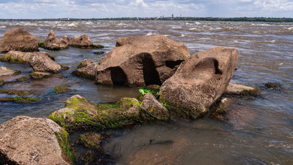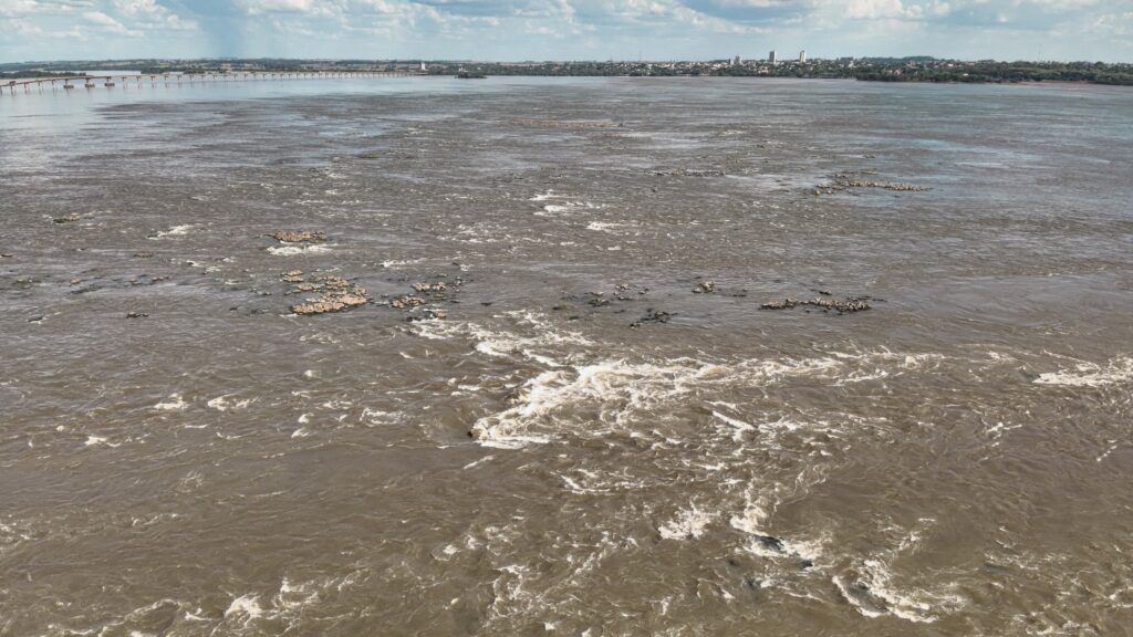 Com a baixa do lago, formações rochosas que remetem às históricas Sete Quedas reaparecem na superfície do Rio Paraná. A paisagem ganha nova configuração. O leito revela contornos que permaneciam ocultos há décadas. O movimento das águas torna-se mais evidente, com ondas e corredeiras que ressaltam a força natural do rio. Pedras antes encobertas permitem que visitantes permaneçam em pé no meio do Rio Paraná, em um ponto que carrega profundo significado histórico e afetivo.