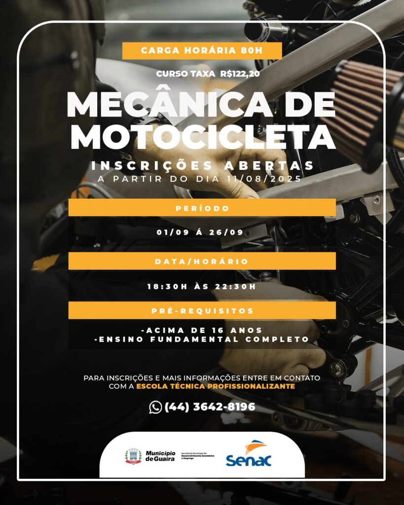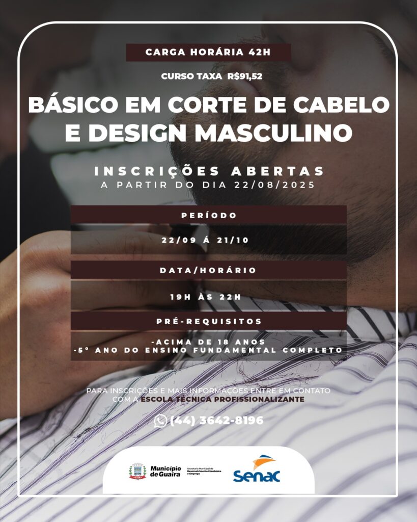 O Município de Guaíra, por meio da Secretaria de Desenvolvimento Econômico e Emprego (SEDE), abriu inscrições para cinco cursos profissionalizantes: Organização de Eventos e Cerimonial, Mecânica de Automóveis, Auxiliar de Informática, Mecânica de Motocicleta e Básico em Corte de Cabelo e Design de Barba Masculino.